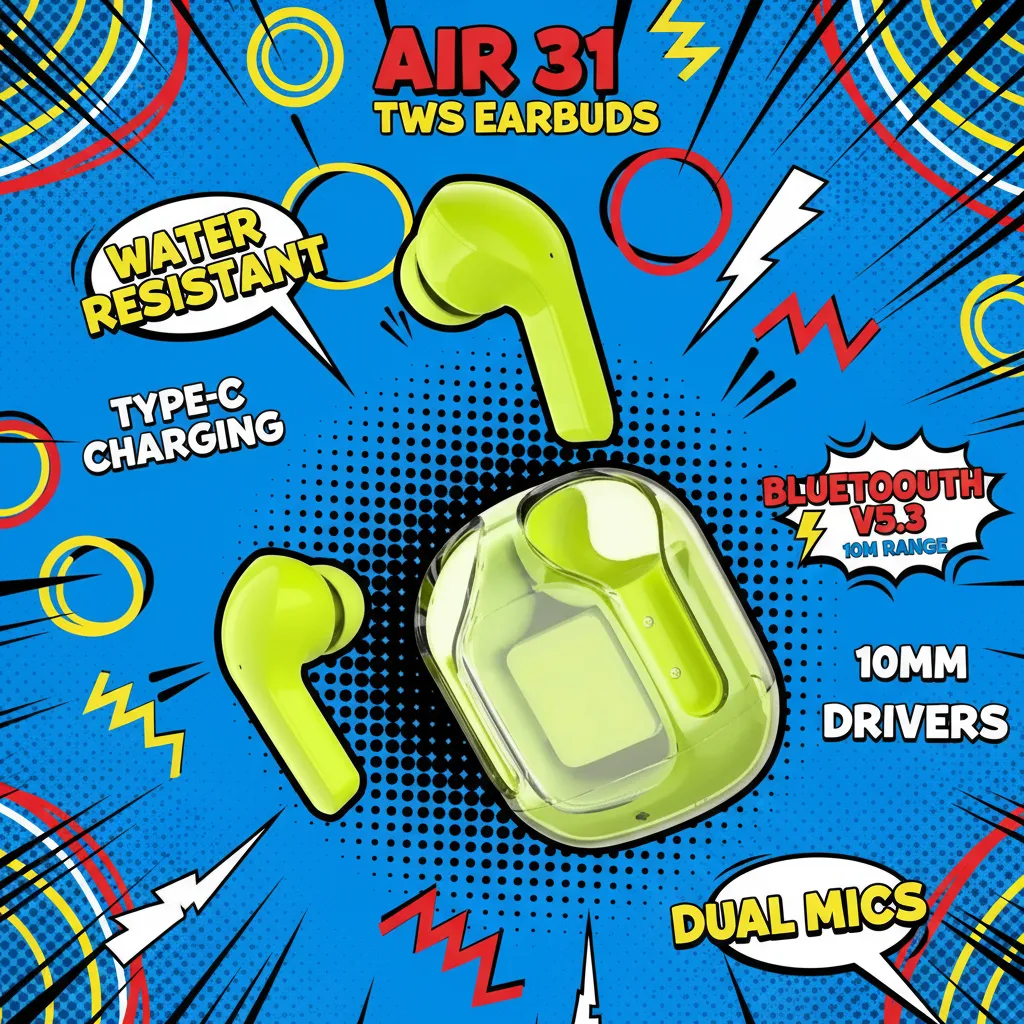 Experience crystal-clear audio with TWS Air 31 Transparent Earbuds. Featuring advanced Bluetooth V5.3, 10mm drivers deliver immersive sound. Stay connected with the built-in HD mic. These water-resistant earbuds boast a sleek transparent design and convenient Type-C charging. Perfect for on-the-go listening, offering reliable wireless performance up to 10m. Elevate your audio experience effortlessly.