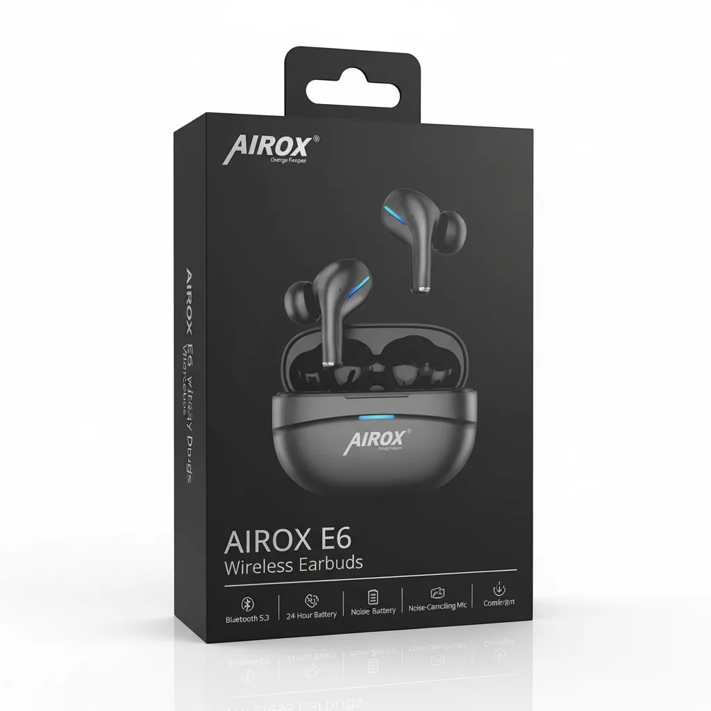 Unleash your sound with the Airox E6 Wireless Earbuds, engineered for exceptional audio and ultimate convenience. These sleek in-ear earbuds boast advanced Bluetooth 5.1 technology, ensuring a stable, lightning-fast connection for uninterrupted music and calls, wherever you go. Dive into your favorite tunes with crystal-clear audio, rich bass, and crisp highs. The comfortable in-ear design provides a secure fit, perfect for your daily commute, intense workouts, or relaxing at home. With its waterproof construction, the Airox E6 is built to withstand sweat and light rain, making it an ideal companion for active lifestyles. Enjoy extended listening sessions with up to 4.5 hours of playtime on a single charge. When it’s time to power up, the earbuds are ready to go in just 1.5 hours. Integrated volume control lets you manage your audio effortlessly, while the built-in microphone ensures hands-free, clear conversations. The Airox E6 combines robust features with a premium listening experience, offering freedom from wires and superior sound quality. Elevate your audio journey with Airox E6. Specifications: Model: E6, Waterproof: Yes, Wearing Type: In-Ear, Volume Control: Yes, Charging Time: 1.5 Hours, Playtime: 4.5 Hours, Bluetooth Version: 5.1, Microphone: Yes.