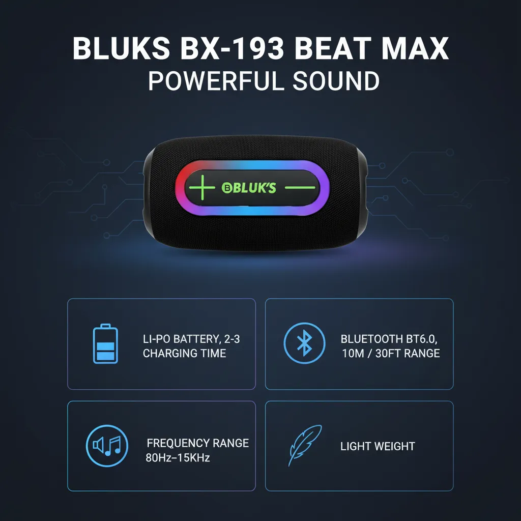 Elevate your audio experience with the Bluks BX-193 Beat Max Powerful Sound Portable Bluetooth Speaker. Engineered for exceptional sound quality, this speaker delivers rich, vibrant audio across an 80Hz–15KHz frequency range, ensuring every beat and note is heard with clarity and depth. Designed for ultimate portability, the Bluks BX-193 boasts a remarkably lightweight build, making it your ideal companion for any adventure, whether you’re at home, travelling, or outdoors.Connectivity is seamless with advanced Bluetooth 6.0 technology, providing a strong and stable wireless connection up to 10 meters (30 feet). Say goodbye to tangled wires and enjoy the freedom of wireless music streaming from your smartphone, tablet, or other Bluetooth-enabled devices. The integrated Li-Po battery ensures dependable power, and with a swift 2-3 hour charging time, you’ll be back to your favorite tunes in no time. The Bluks BX-193 Beat Max combines powerful performance, sleek design, and convenient features, offering an outstanding wireless audio solution for music lovers everywhere. Immerse yourself in superior sound quality wherever life takes you.