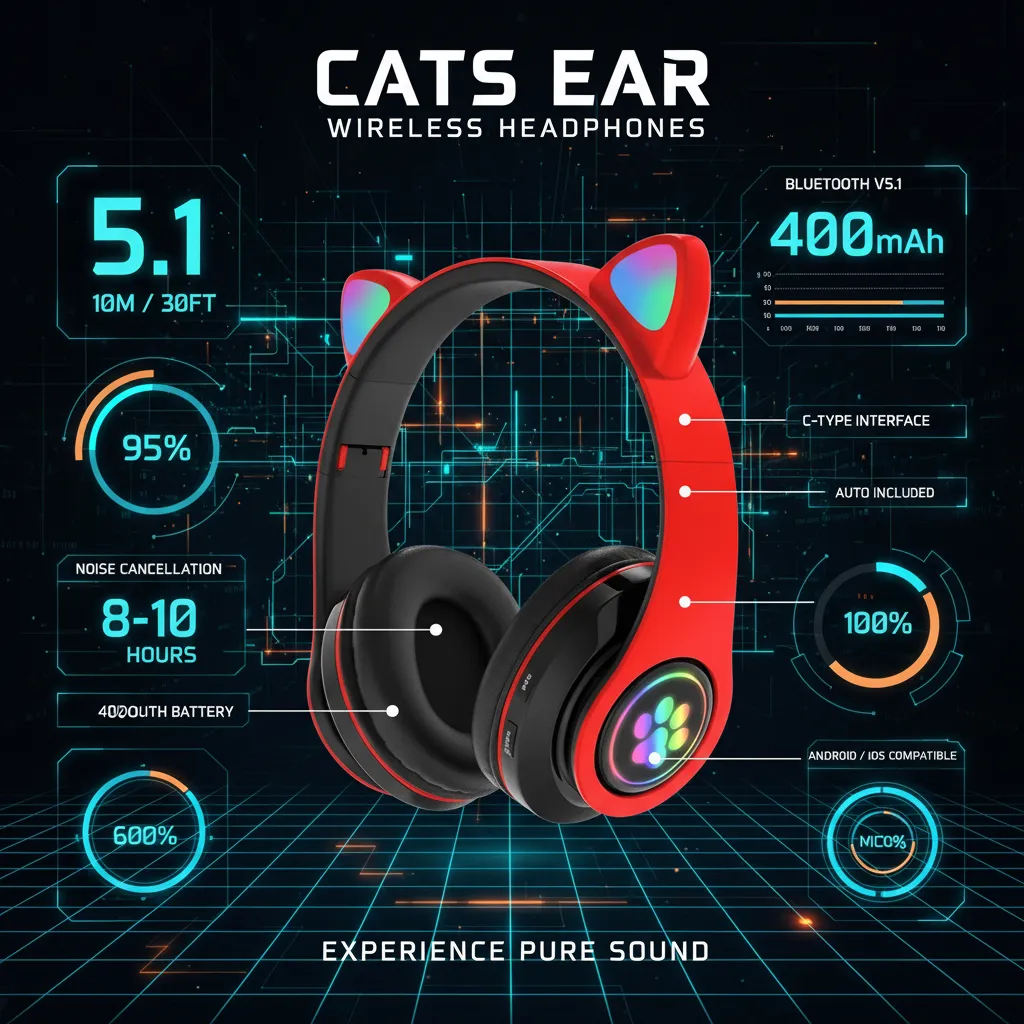 Immerse yourself in exceptional sound with the Cats Ear Wireless Headphones, designed for ultimate audio freedom and style. These cutting-edge headphones boast advanced Noise Cancellation technology, allowing you to focus purely on your music or calls by blocking out distractions. With Bluetooth V5.1 connectivity, enjoy a stable and extended wireless range of up to 10 meters (30 feet), ensuring seamless audio streaming wherever you are. Equipped with a sensitive built-in microphone, the Cats Ear Wireless Headphones are perfect for hands-free calls, providing crystal-clear communication. Auto Pairing simplifies your experience, connecting instantly to your device. Charge effortlessly via the modern C-Type interface. Each earbud features a robust 400mAh battery, delivering an impressive 8-10 hours of continuous playtime, so your music never stops. Universally compatible with both Android and iOS devices, these Cats headphones are your perfect mobile accessory for unparalleled sound quality and convenience. Elevate your listening experience with Cats – where style meets superior performance.